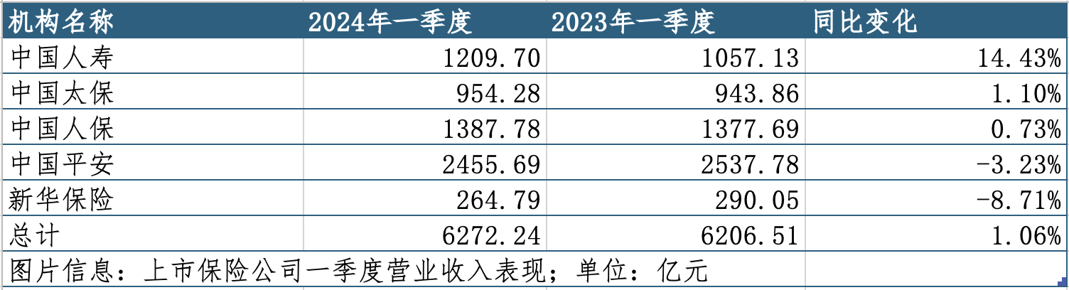 时间进入五月,A股五家上市保险公司已悉数完成一季报披露。据统计,中国人寿(601628)、中国平安(601318)、中国人保(601319)、中国太保(601601)、新华保险(601336)共实现营业收入6272.24亿元,同比微增1.06%;但同时,五家公司归母净利总计830.17亿元,同比降幅达9.16%。