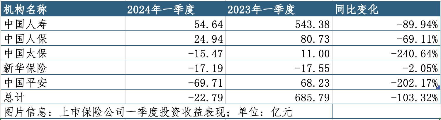 一季报显示,A股五家上市保险公司报告期内投资收益总计亏损22.79亿元,同比降幅达103.32%。