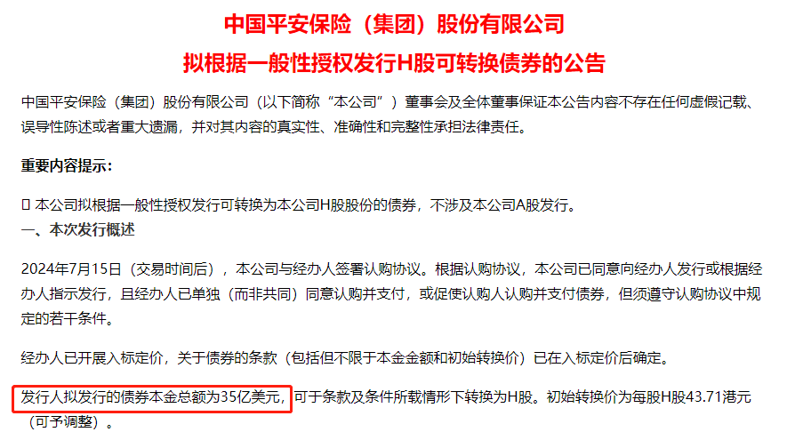7月16日早上,中国平安披露拟根据一般性授权发行H股可转换债券的公告。中国平安表示,拟根据一般性授权发行可转换为本公司H股股份的债券,不涉及本公司A股发行。拟发行的债券本金总额为35亿美元,可于条款及条件所载情形下转换为H股。初始转换价为每股H股43.71港元(可予调整)。
