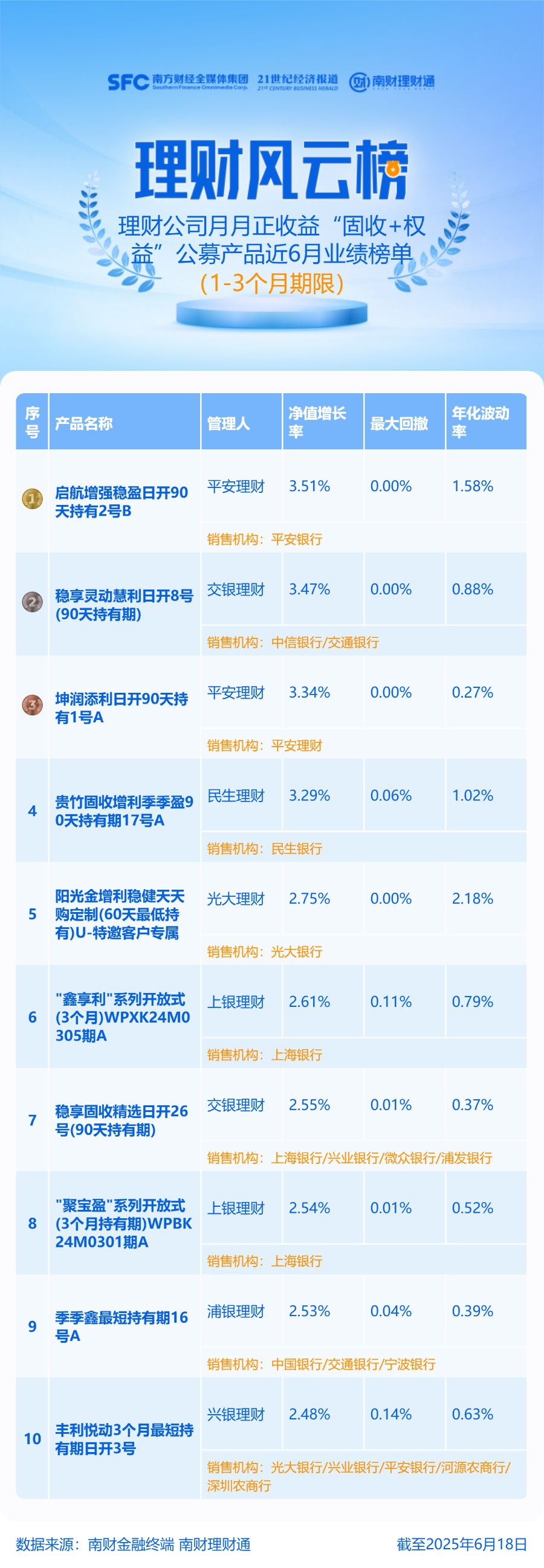 产品统计截止日期为2025年6月18日,上榜产品每周均有净值披露。榜单排名来自理财通AI全自动化实时排名,如您对数据有疑问,请在文末联系助理进一步核实。