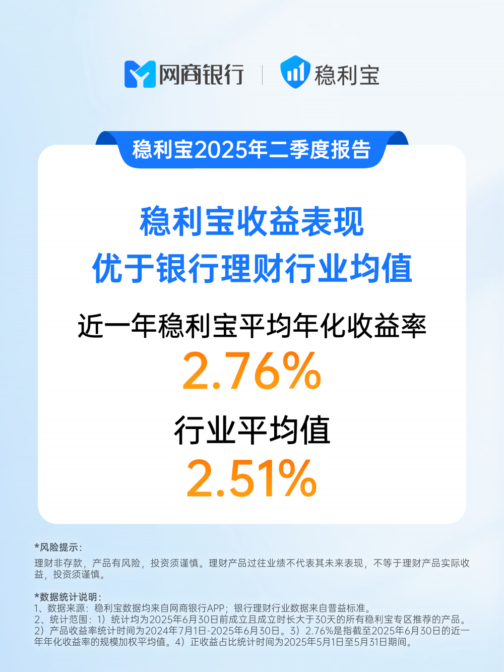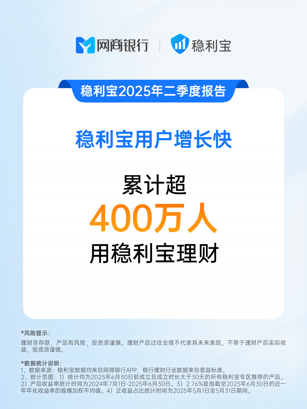 笔者了解到,由于稳利宝所选产品均为R2、R1中低风险登记产品,投向存款与优质债券等固收类资产,其整体收益表现高于银行理财行业均值:近一年稳利宝平均年化收益率2.73%,行业均值为2.51%。期间稳利宝主推产品正收益比例为100%,同样高于银行理财全行业的 97.9%。据悉,二季度末稳利宝用户规模已突破400万人。与此同时,新用户复购率和复购金额持续提高,每3个稳利宝新用户中,有2人都配置了两笔以上理财产品,超过60%的用户复购金额比第一笔高。