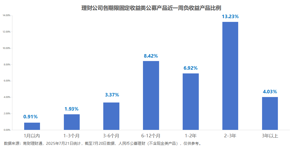 固定收益类产品中,各期限产品近一周浮亏的比例上升,或与上周债市震荡有一定关系。南财理财通数据显示,2~3年期限近一周负收益产品占比最高,为13.23%,1个月以内投资期限负收益产品数量占比最低,为0.91%。