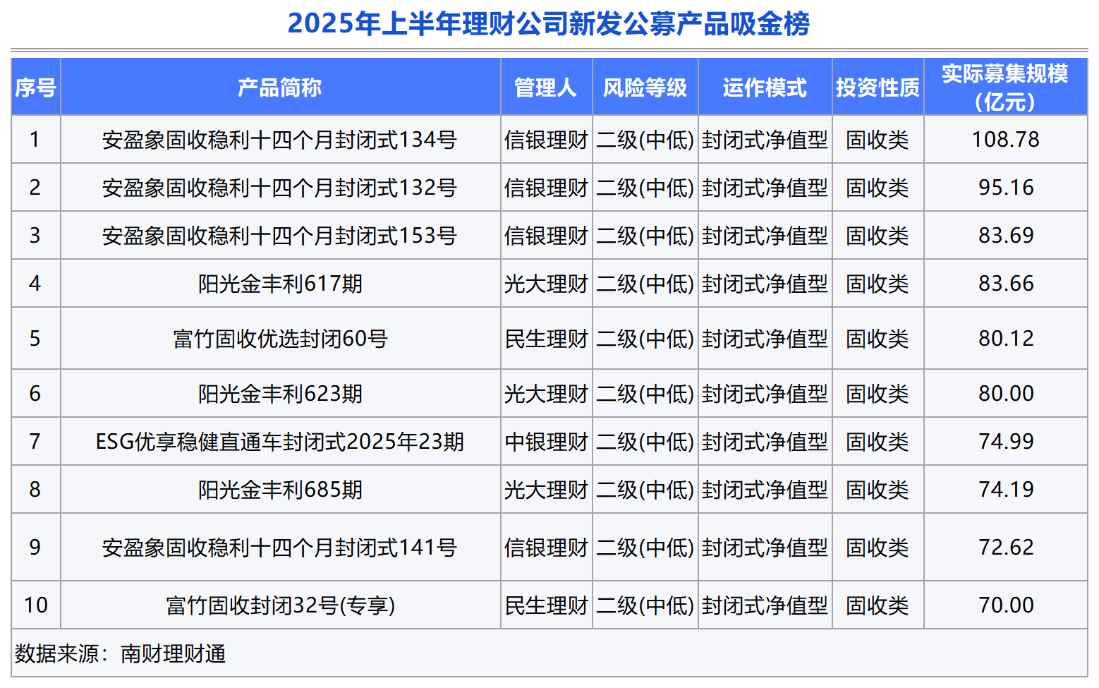 从角逐募集规模榜单前十的产品看,2025年上半年的产品竞争明显相比2024年上半年更为激烈,除信银理财、民生理财常居吸金榜前列外,光大理财、中银理财也出现了强吸金的系列单品,如光大理财的“阳光金丰利”系列,有三只产品上榜。此外,前十名产品的募集总规模也相较2024年上半年有明显增长,合计达到823.2亿元,同比上涨24.88%。不过,百亿元的募集规模是一个分水岭,2025年上半年和2024年上半年均只有一款产品募集规模超过100亿元,均来自信银理财的安盈象固收稳利14个月系列。从上榜产品看,中低风险、封闭式、固收类是普遍的产品特点,且大多数产品投资周期均为1—2年,仅排名第七的中银理财产品和排名第十的民生理财产品投资周期为半年。