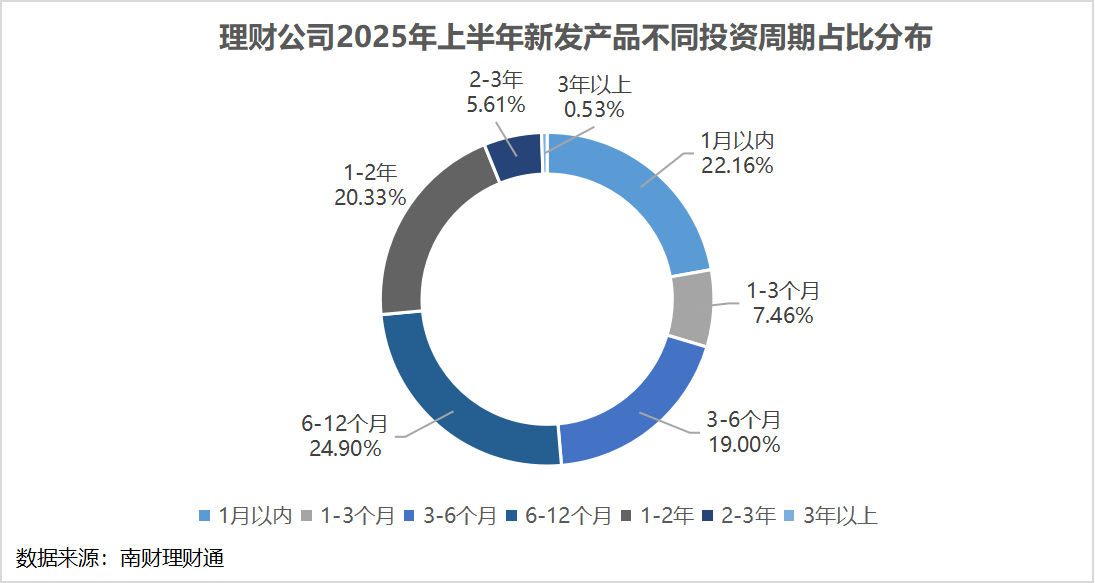 为了迎合客户的风险偏好,理财公司逐渐转向发行流动性更高的开放式产品,同时产品的短期化趋势明显。从新发产品的投资期限比例看,1月以内期限产品占比已经突破20%,达到22.2%,同比2024年上半年提高了5.5%的百分点,相较之下,3—6月、6—12月期限产品占比出现明显下滑,其中3—6月期限产品比例同比下降了6.3个百分点,其余期限产品整体变动不大。