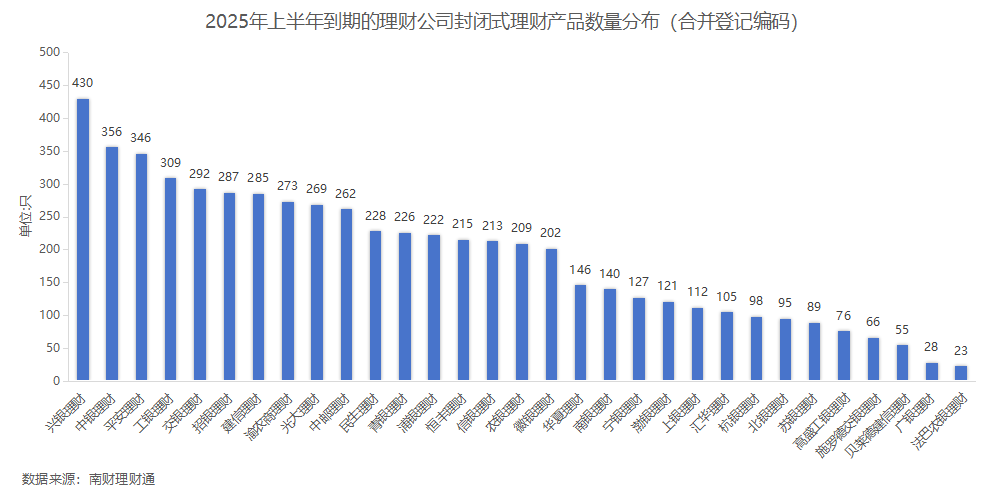 分机构来看,兴银理财、中银理财、平安理财和工银理财到期产品数量位列前四,2025年上半年到期产品数量超300只。