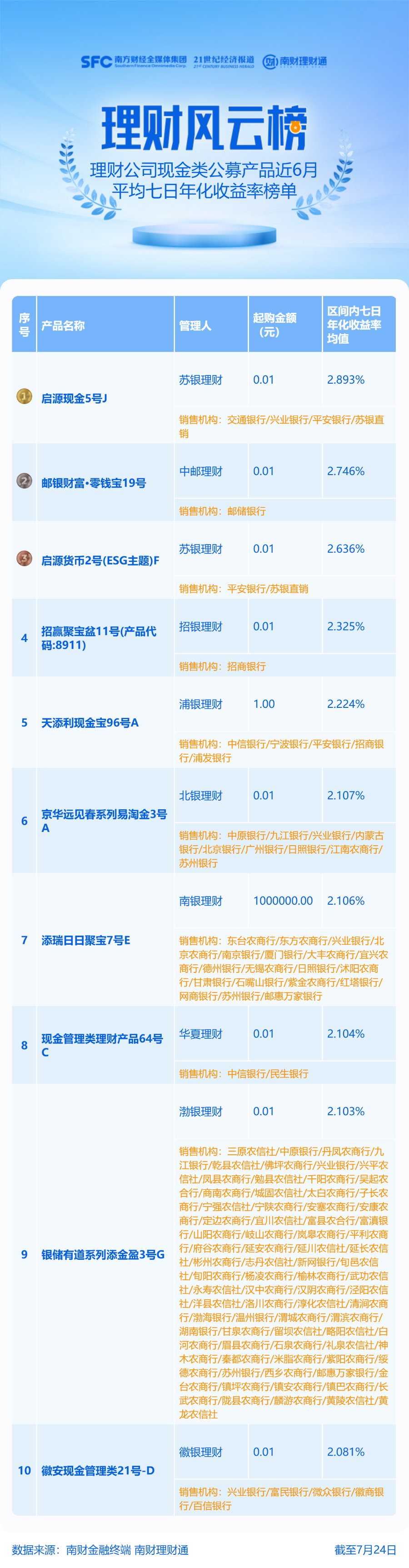 收益表现最优的现金类产品近6个月平均七日年化收益率也未超过3%,苏银理财“启源现金5号J”七日年化收益率均值2.893%位列第一。