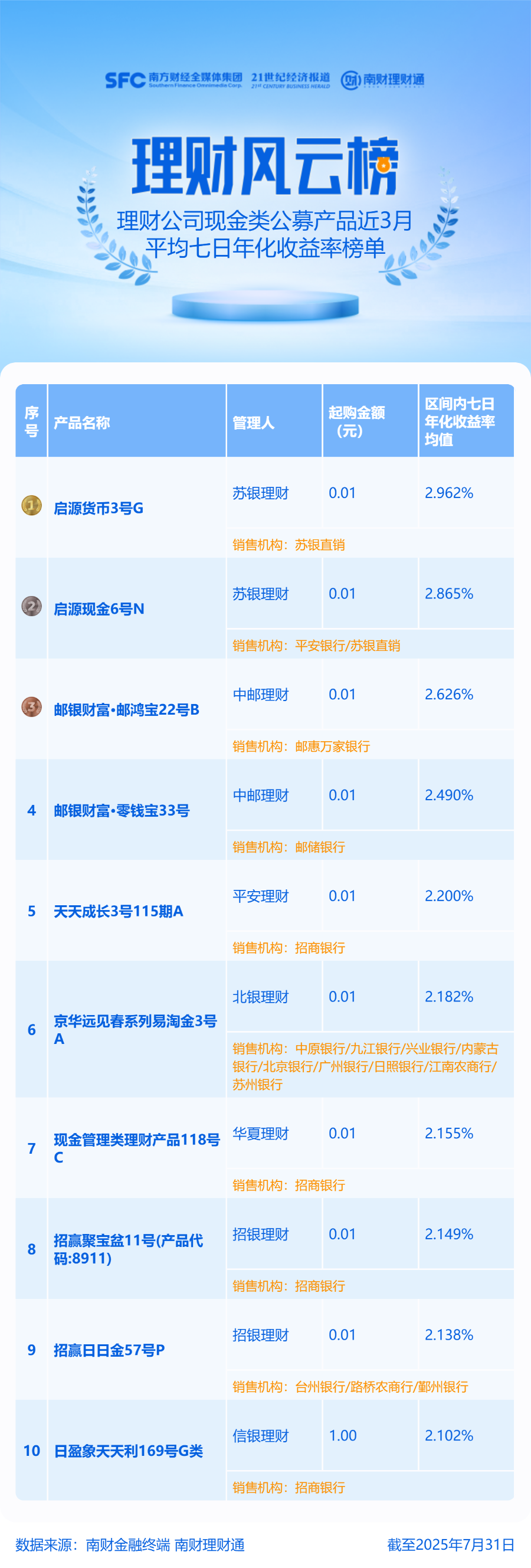 榜单前三位苏银理财“启源货币3号G”“启源现金6号N”和中邮理财“邮银财富·邮鸿宝22号B”近3月平均七日年化收益率超2.5%。