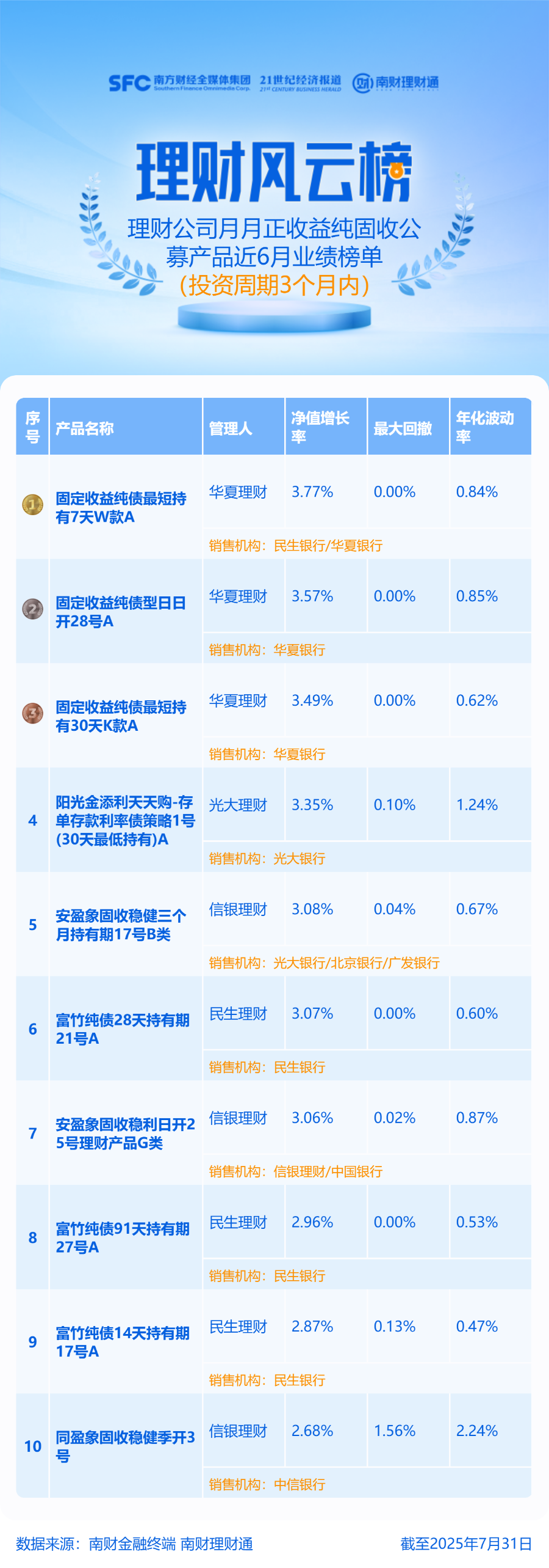 产品统计范围为理财公司发行的投资周期在3月以内(含)的公募纯固收产品,且近6月每个完整的自然月月末均为正收益。产品统计截止日期为2025年7月31日,统计区间为近6月。