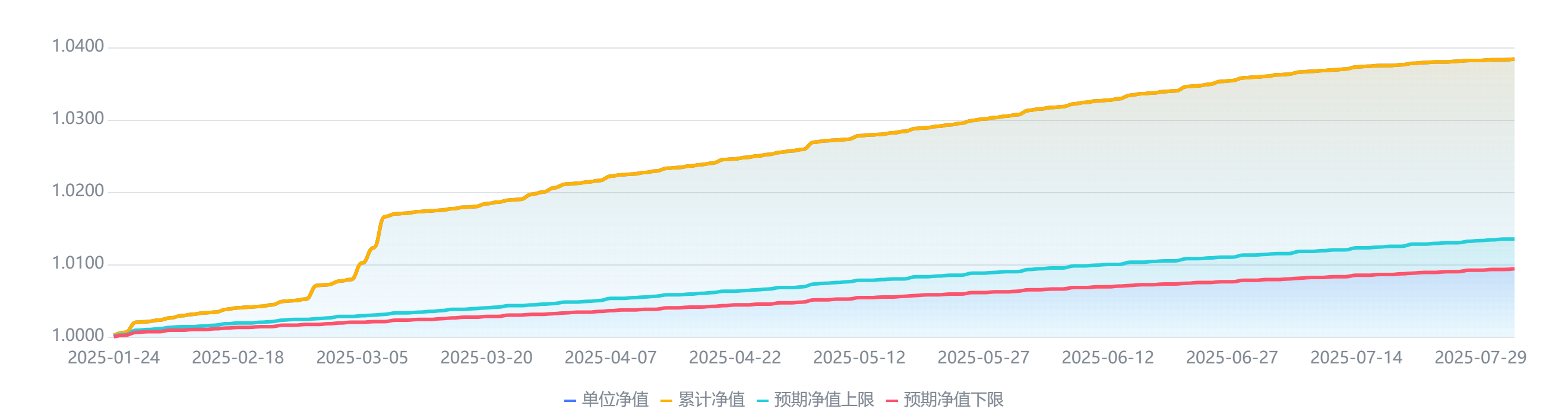 从榜首“固定收益纯债最短持有7天W款A”成立以来(2025年1月24日)净值表现来看,该产品在2月底至3月初有一段较为明显的净值跳涨,此后净值平稳上行。