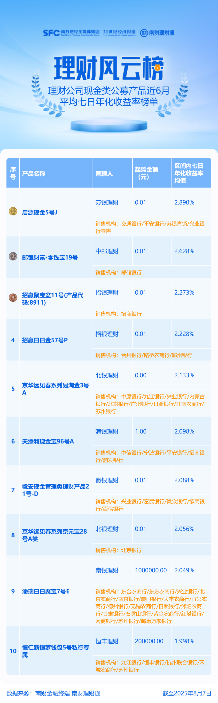榜单前两位苏银理财“启源现金5号J”和中邮理财“邮银财富·零钱宝19号”近6月平均七日年化收益率超2.6%。