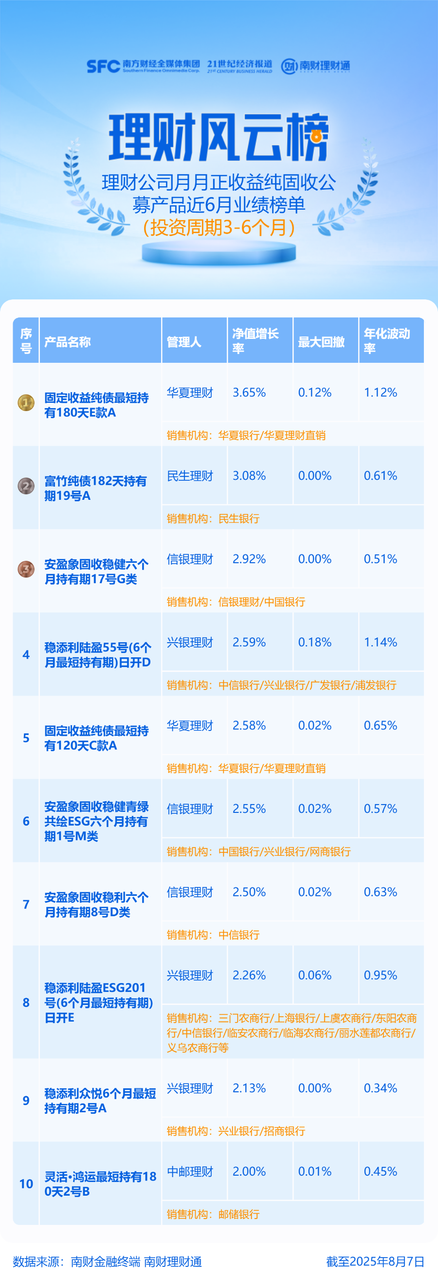产品统计范围为理财公司发行的投资周期在3—6个月(含)的公募纯固收产品,且近6月每个完整的自然月月末均为正收益。产品统计截止日期为2025年8月7日,统计区间为近6月。