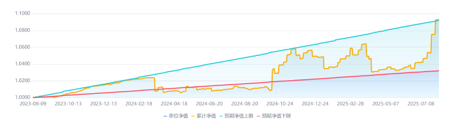从净值走势看,该产品波动率较高,近6月年化波动率达5.33%,但今年4月中旬后净值上行速度较快,净值逼近预期净值上限(按业绩比较基准上限4.60%折算)。