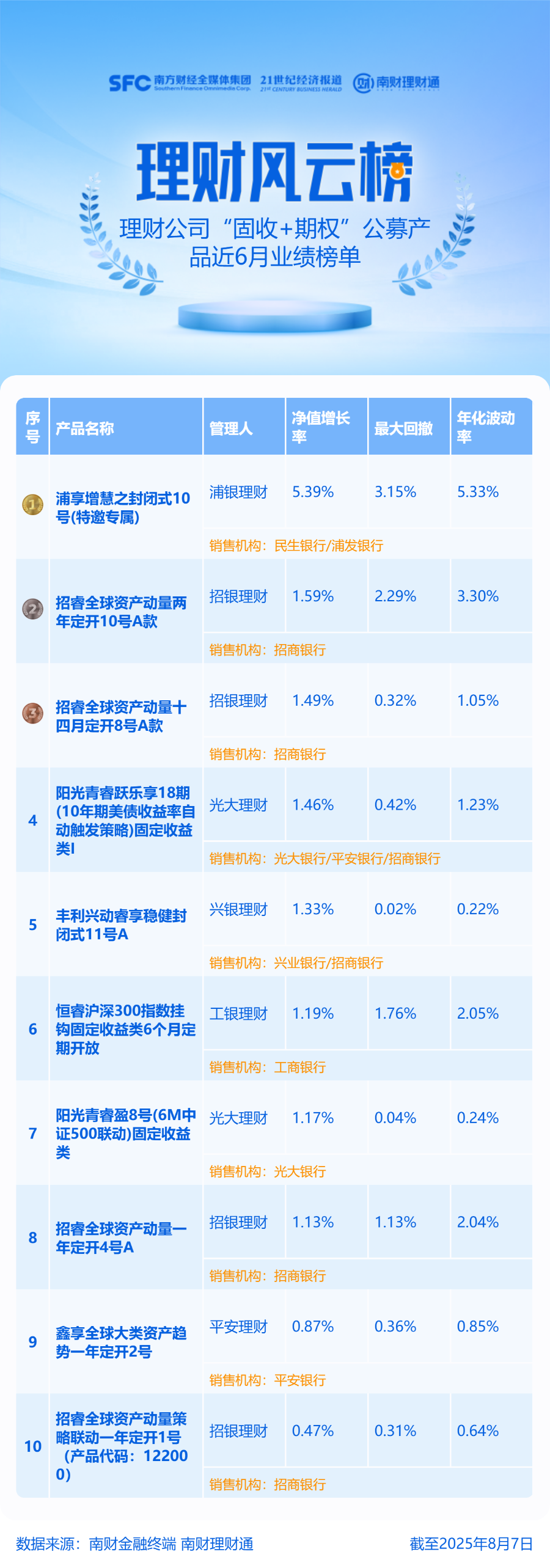 产品统计范围为理财公司发行的公募“固收+期权”理财产品,统计截止日期为2025年8月7日,统计区间为近6个月。