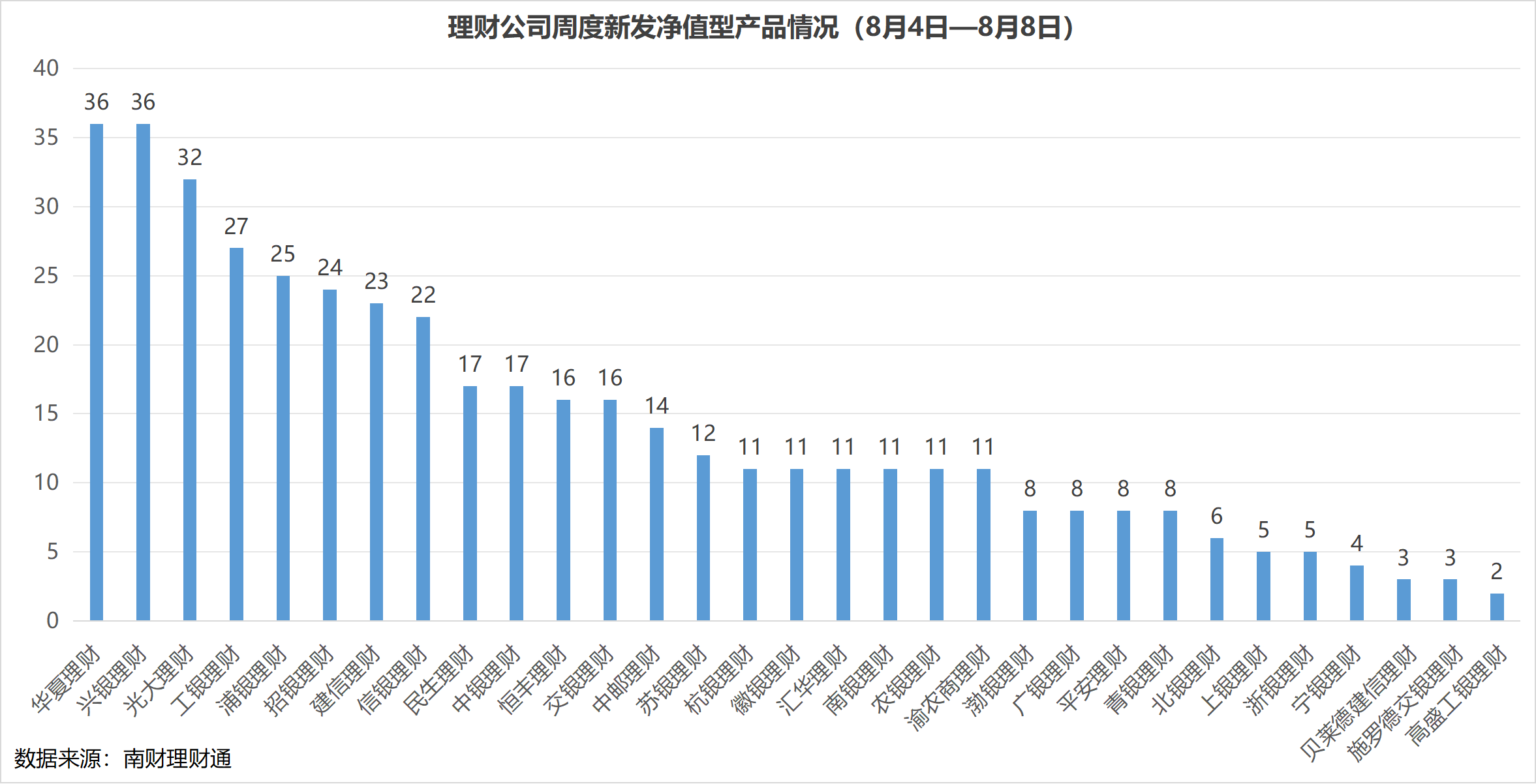 产品数量:南财理财通数据显示,31家理财公司上周(8月4日—8月8日)合计发行了443只理财产品(同一产品登记编码下不同份额合并计算),股份行理财公司产品发行量居前,兴银理财和华夏理财均发行了36只,光大理财发行了32只。
