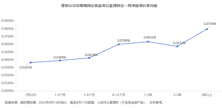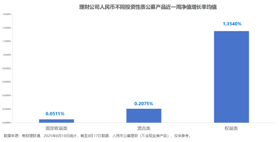 破净产品数量处于低位。南财理财通数据显示,截至2025年8月17日,理财公司共有25,210只存续公募理财产品,其中141只累计净值低于1,银行理财综合破净率为0.56%。权益类、混合类理财破净率分别为35.71%和4.8%;固定收益类公募理财破净率为0.28%。