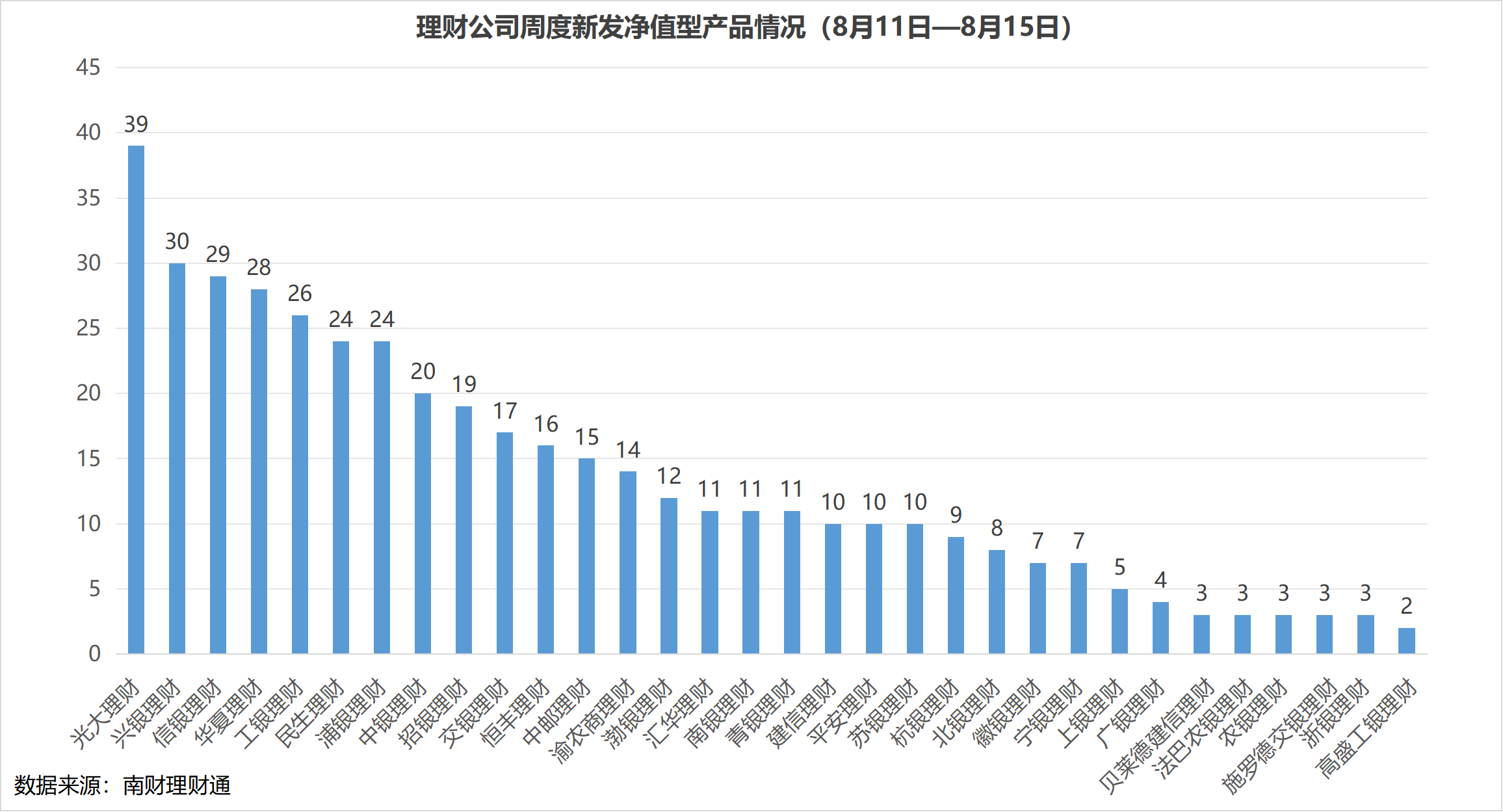 产品数量:南财理财通数据显示,32家理财公司上周(8月11日—8月15日)合计发行了433只理财产品(同一产品登记编码下不同份额合并计算),股份行理财公司产品发行量居前,光大理财发行了39只,兴银理财发行了30只,信银理财发行了29只。