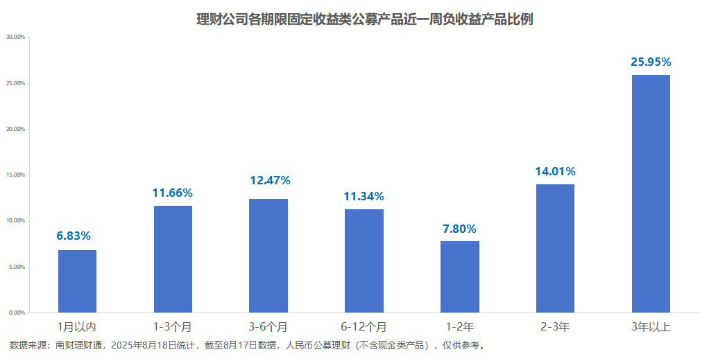 约一成固定收益类产品近一周浮亏。南财理财通数据显示,3年以上期限近一周负收益产品占比最高,为25.95%。1个月以内投资期限负收益产品数量占比最低,为6.83%。