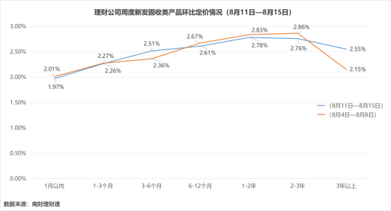 产品定价:上周,除3—6月、3年以上期限产品定价出现回升外,其余期限产品定价均有所下行。其中1—2年、2—3年期限产品定价跌至2.80%以下,1月以内期限产品定价重回2%以下。相比之下,3年以上期限产品定价显著回升,达到2.55%,但仍低于6—12月、1—2年、2—3年期限产品的定价水平。