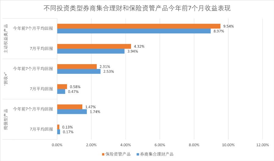 主动权益类产品则以保险资管产品表现更优,保险资管产品今年前七个月平均回报达 9.54%,而券商集合理财产品为 8.97%。