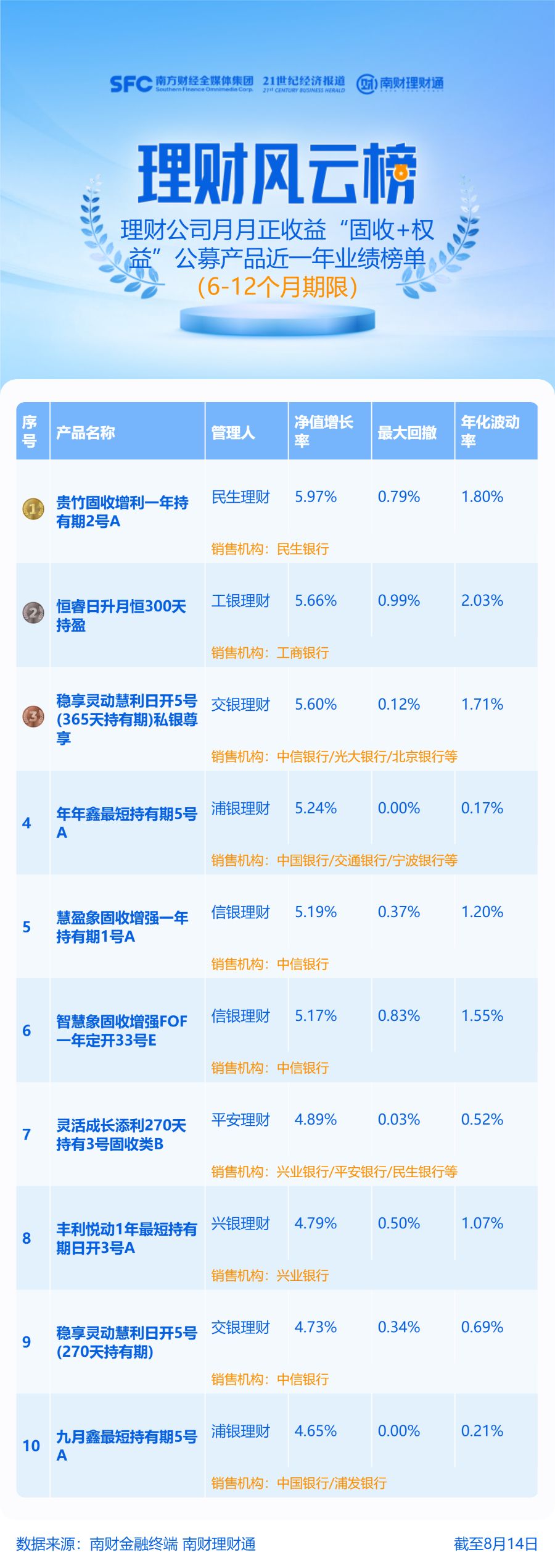 产品统计范围为理财公司6—12个月(含)期限的“固收+权益”理财公募产品,统计截止日期为2025年8月14日,统计区间为近一年。