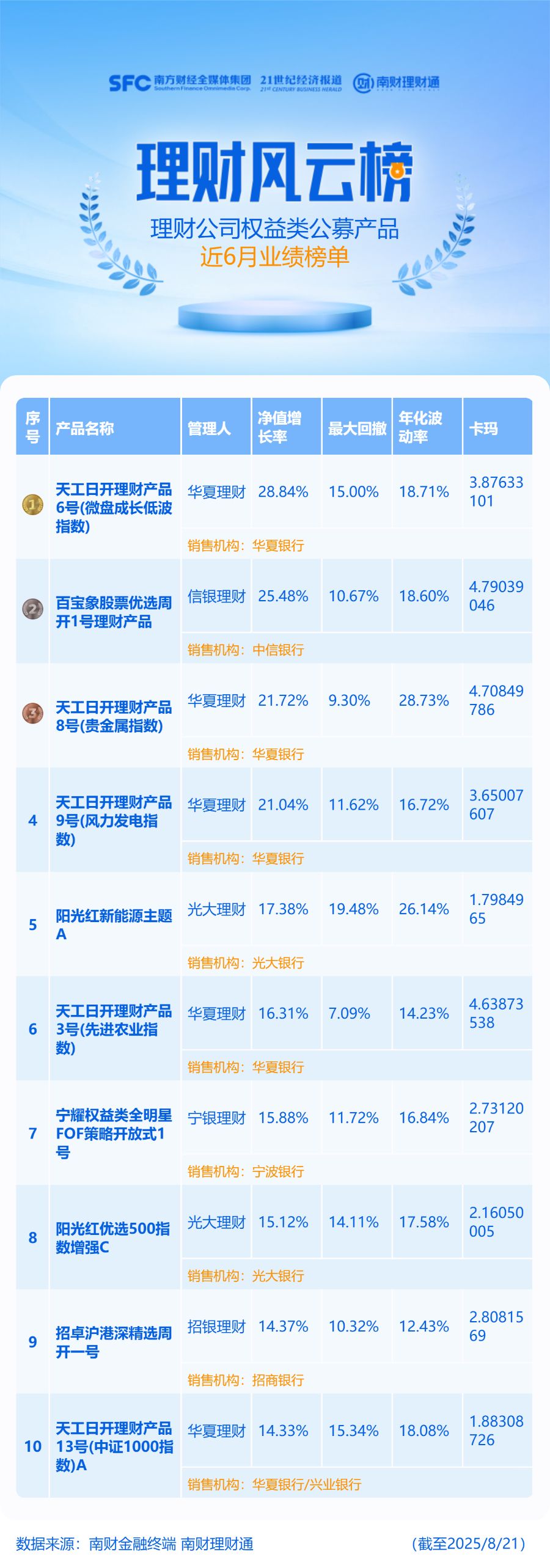 权益类产品范围为理财公司发行的公募权益类产品,统计截止日期为2025年8月21日,统计区间为近6月。