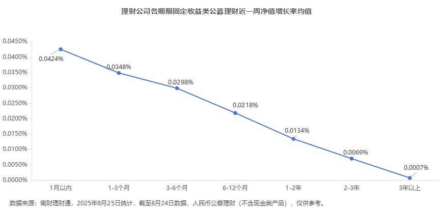 周度收益情况:固收类理财收益继续下行,短期限产品表现相对较好。固定收益类理财近一周平均净值增长率为0.0252%,混合类、权益类产品近一周平均净值增长率分别为0.2489%、2.2894%。固定收益类产品中,1个月以内期限固定收益类产品周收益率最高,近一周净值增长率均值为0.0424%。3年以上期限产品近一周净值增长率均值最低,为0.0007%。