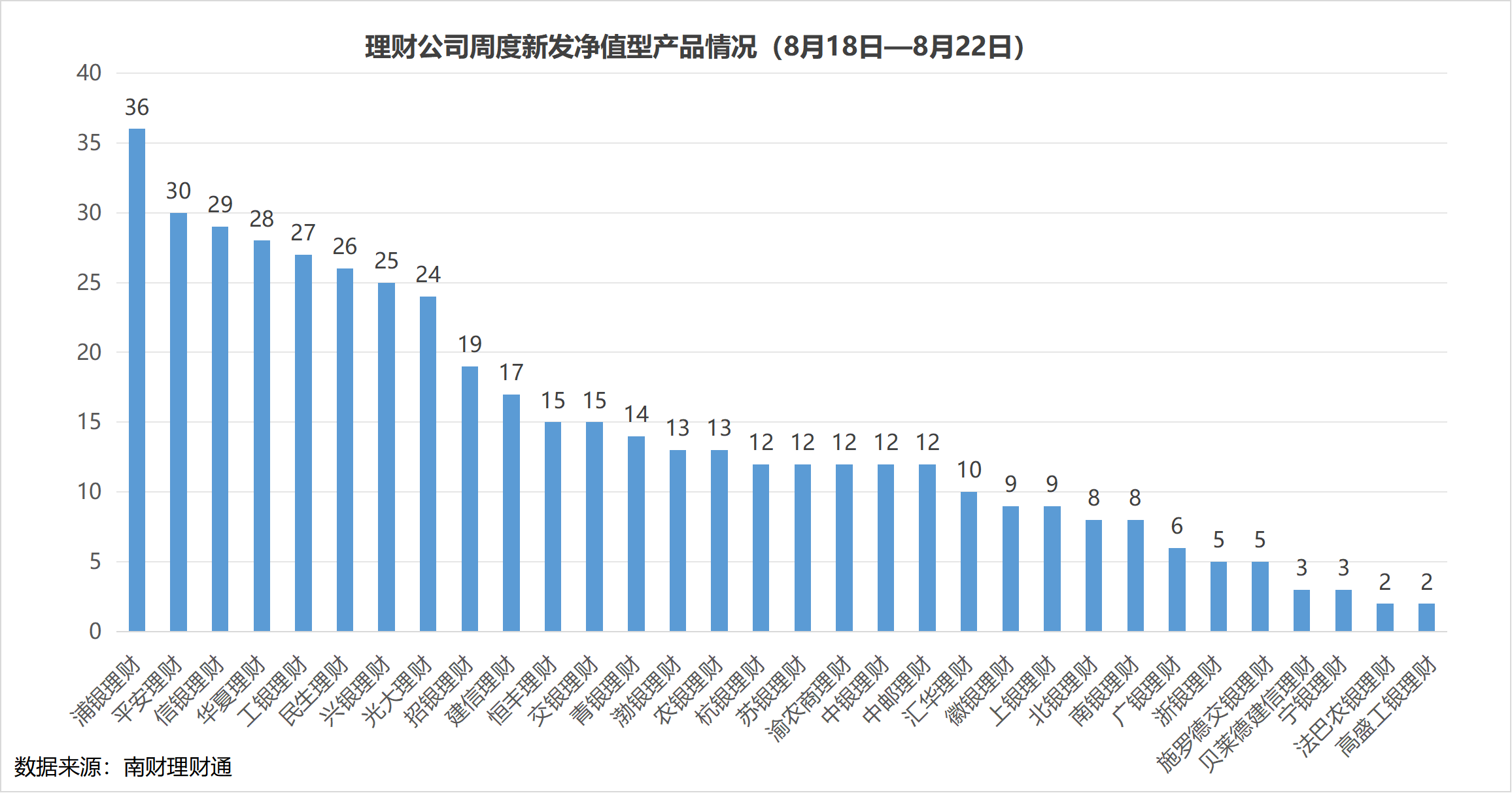 产品数量:南财理财通数据显示,32家理财公司上周(8月18日—8月22日)合计发行了461只理财产品(同一产品登记编码下不同份额合并计算),股份行理财公司产品发行量居前,浦银理财发行了36只,平安理财发行了30只,信银理财发行了29只。