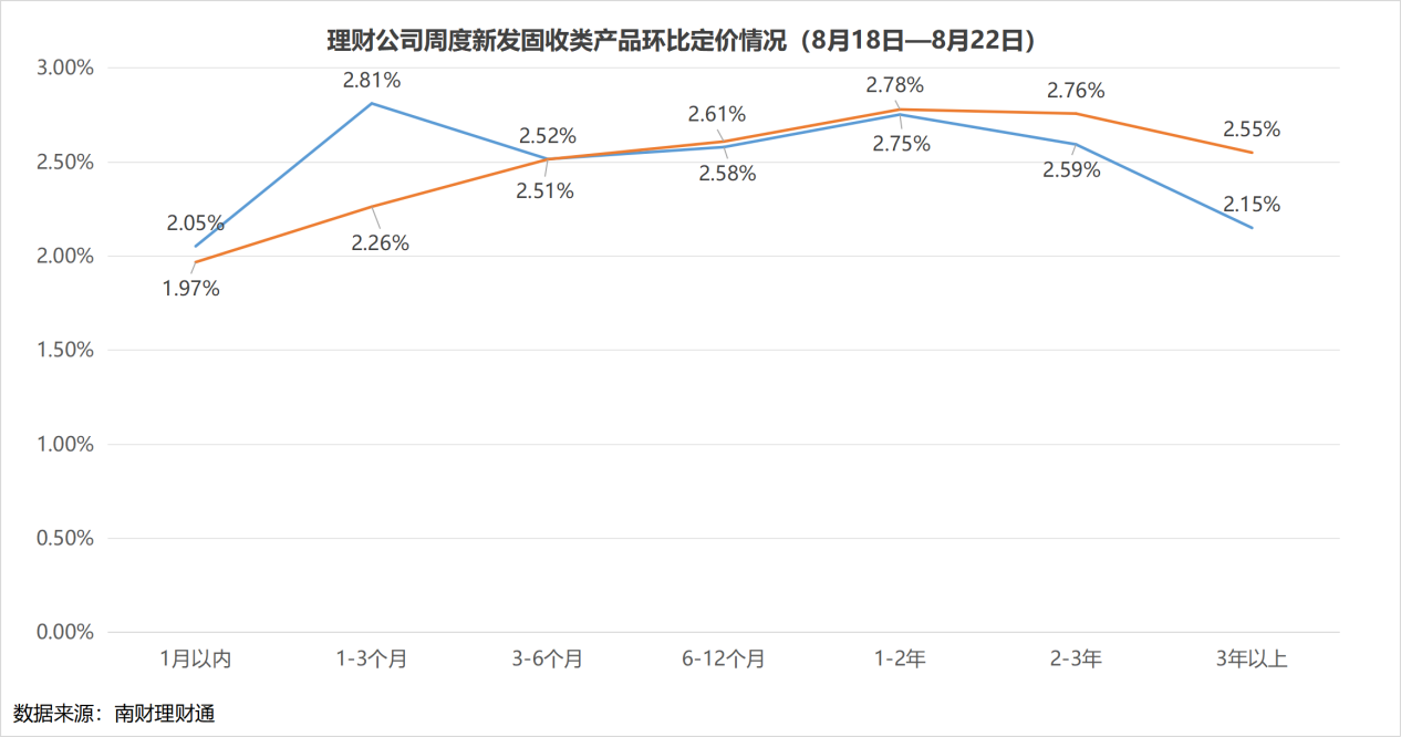 产品定价:上周,6个月以内短期限产品和6个月以上期限产品的定价变动出现分化。6个月以内期限产品定价维持不变或有所上行,其中1—3月期限产品显著上调55个基点,平均定价达到2.81%。6个月以上期限产品定价有所下滑,其中3年以上期限产品定价下滑了40个基点,为2.15%。至此,3年以上期限产品的定价已低于所有其他期限,仅1个月及以下期限产品除外。