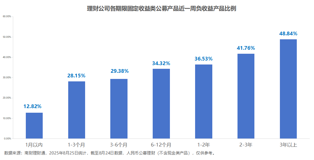 约三成固定收益类产品近一周浮亏。南财理财通数据显示,3年以上期限近一周负收益产品占比最高,为48.84%。1个月以内投资期限负收益产品数量占比最低,为12.82%。