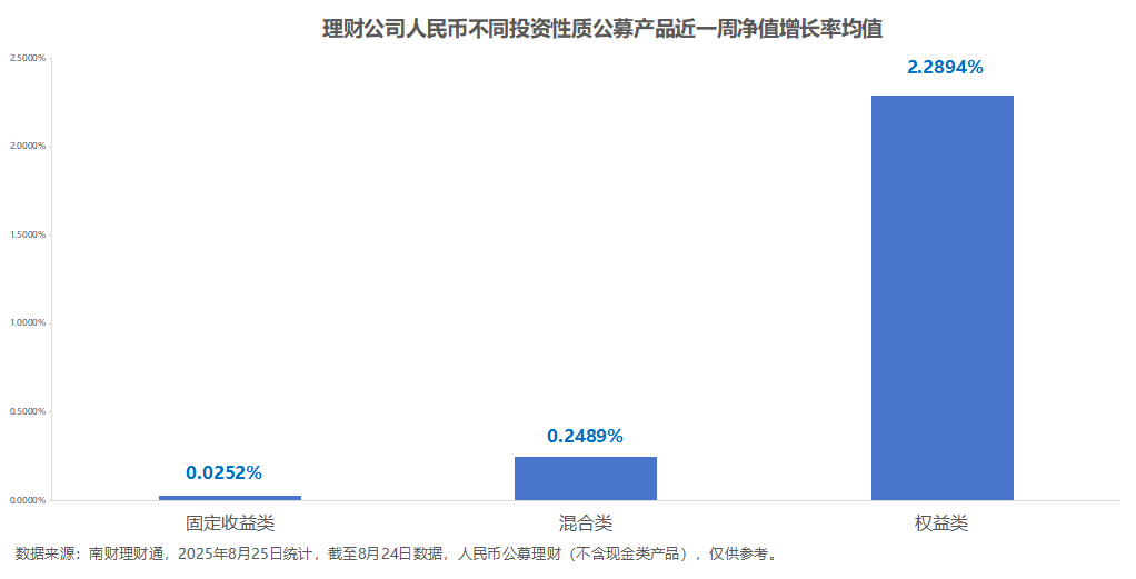破净产品数量处于低位,但破净率上升。南财理财通数据显示,截至2025年8月24日,理财公司共有25,444只存续公募理财产品,其中316只累计净值低于1,银行理财综合破净率为1.24%。权益类、混合类理财破净率分别为28.57%和4.5%;固定收益类公募理财破净率为1.03%。
