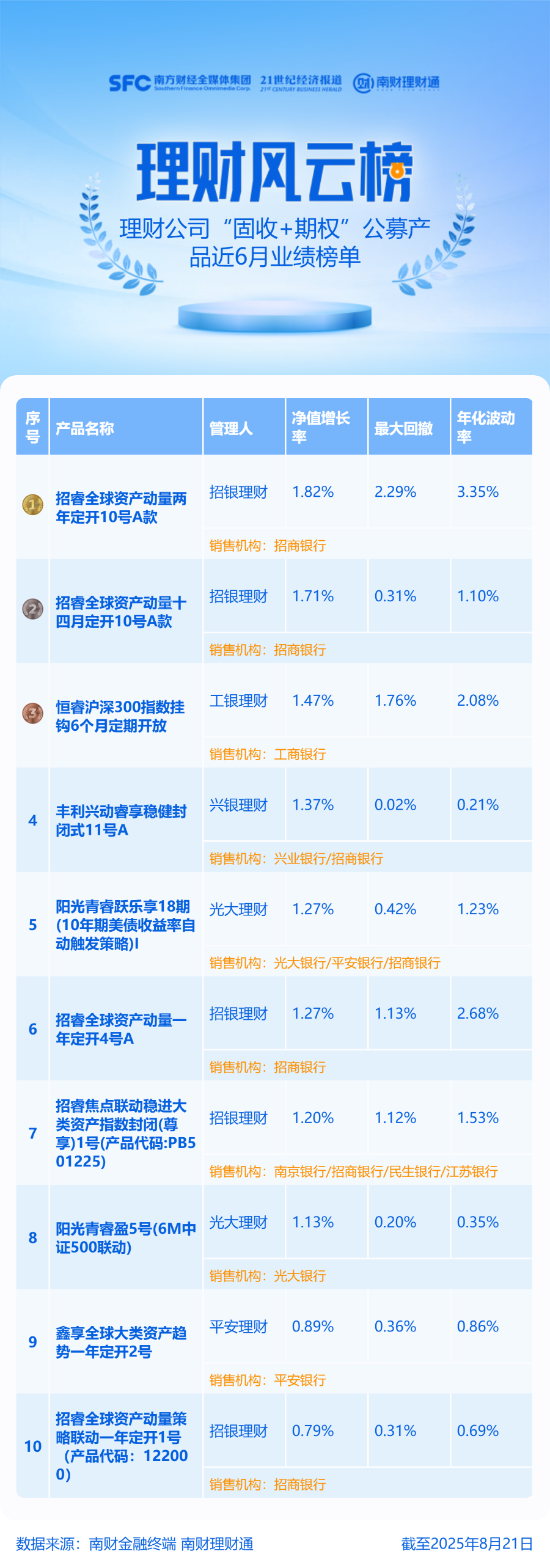 产品统计范围为理财公司发行的公募“固收+期权”理财产品,统计截止日期为2025年8月21日,统计区间为近6个月。