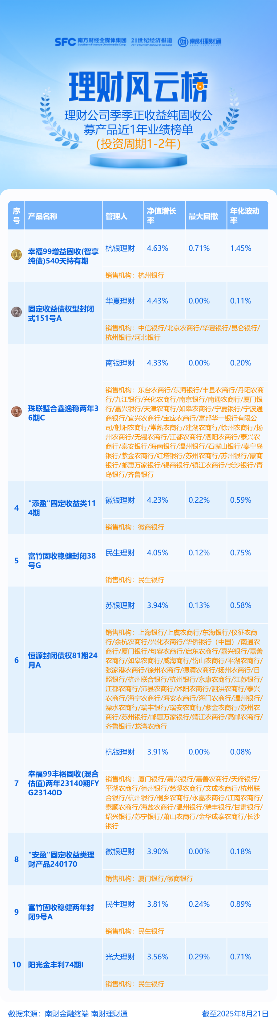 产品统计范围为理财公司发行的投资周期在1—2年(含)的公募纯固收产品,且近1年每个完整的自然季季末均为正收益。产品统计截止日期为2025年8月21日,统计区间为近1年。