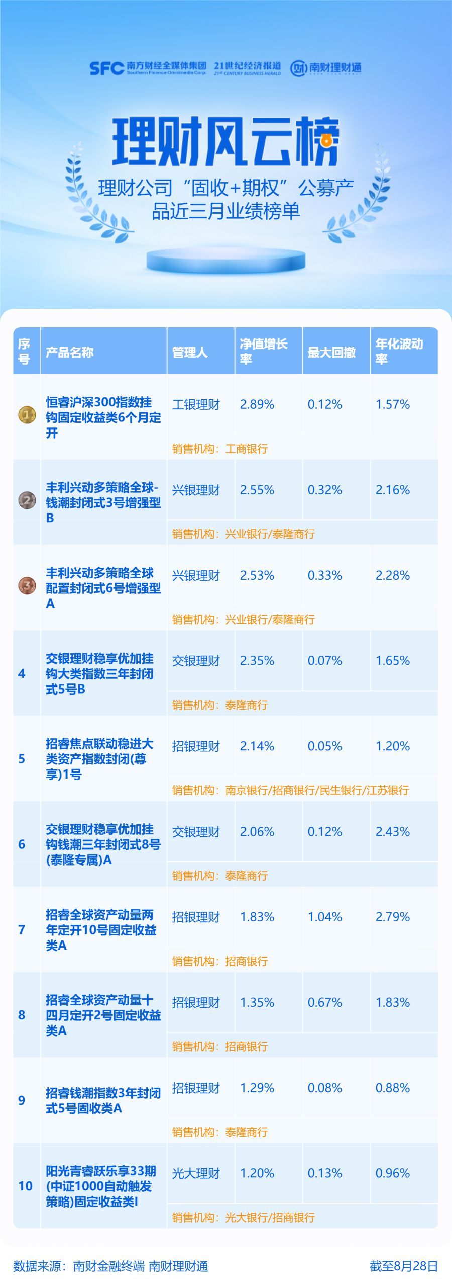 产品统计范围为理财公司发行的“固收+期权”公募理财产品,统计截止日期为2025年8月28日,统计区间为近3个月。