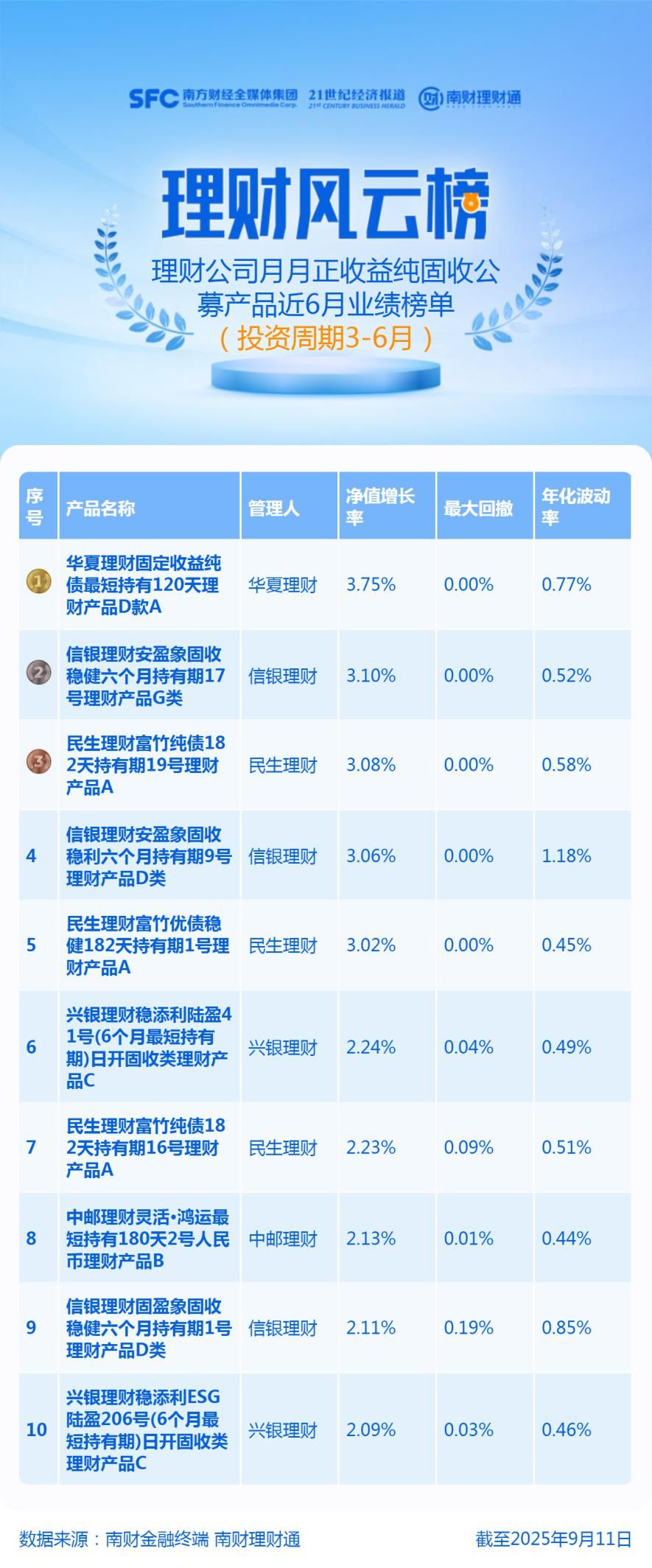 产品统计范围为理财公司发行的投资周期在3—6个月(含)的公募纯固收产品,且近6月每个完整的自然月均实现正收益。产品统计截止日期为2025年9月11日,统计区间为近6月。