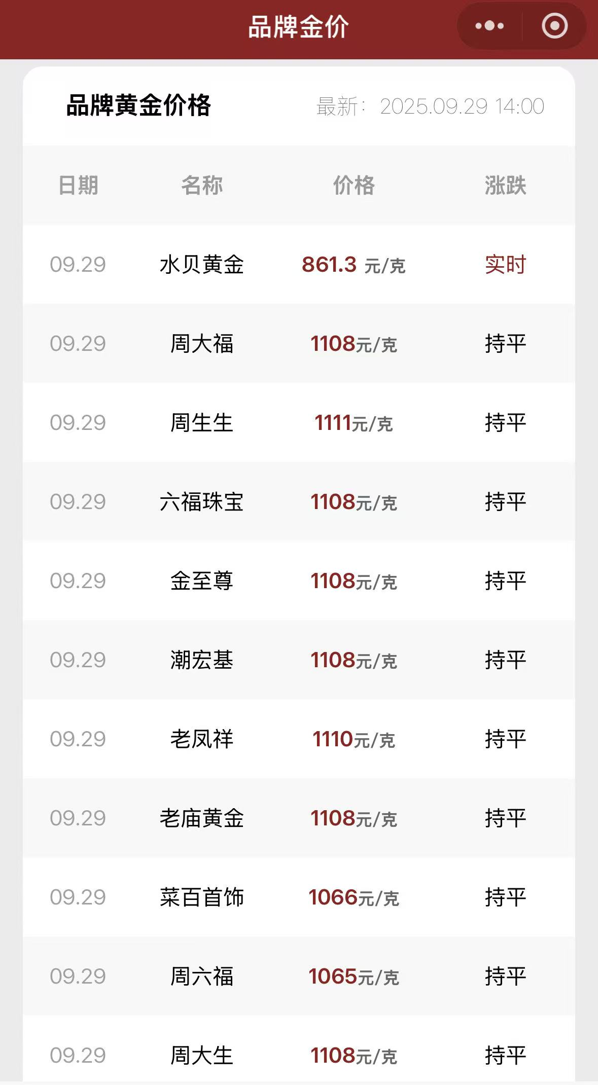 现货黄金走高的同时,国内金饰价格也屡创新高。根据今日金价小程序,截至9月29日,国内金饰克价悉数站上1100元。周生生金饰价格为1111元/克,周大福、潮宏基(002345)、老庙黄金、六福珠宝等均为1108元/克。