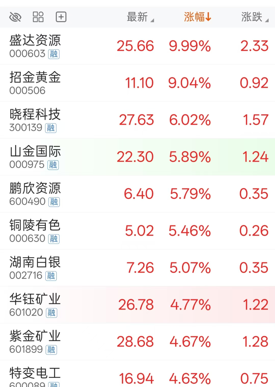 贵金属板块午后拉升。截至13:08,盛达资源(000603)涨停,招金黄金(000506)触及涨停,晓程科技(300139)、山金国际(000975)、鹏欣资源(600490)等跟涨,兴业银锡(000426)、紫金矿业(601899)盘中续创历史新高。