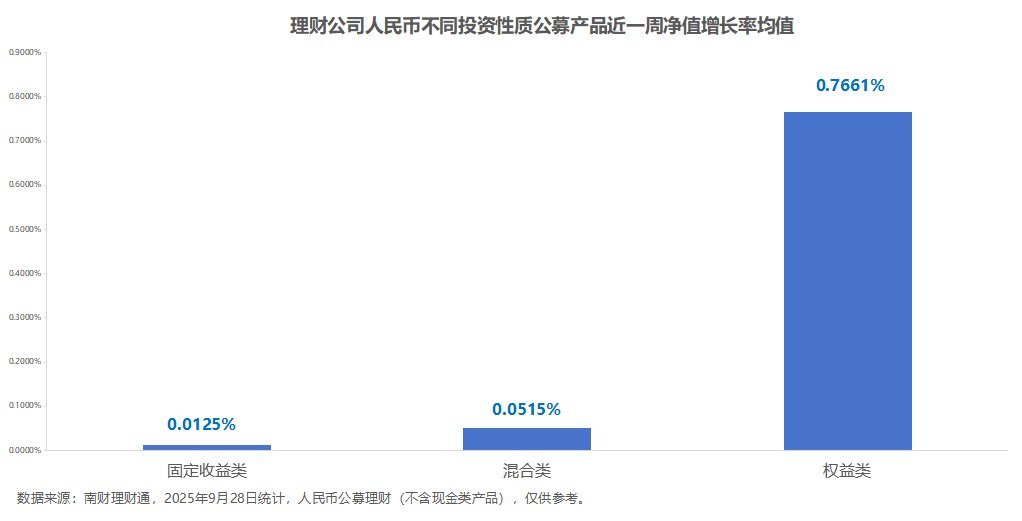 周度收益情况:因债市表现不佳,固定收益类理财收益下降。固定收益类理财近一周平均净值增长率为0.0125%,混合类、权益类近一周平均净值增长率分别为0.0515%、0.7661%。固定收益类产品中,1个月以内期限产品近一周净值增长率均值最高,为0.028%。3年以上期限产品周收益率最低,近一周净值增长率均值为-0.0425%。