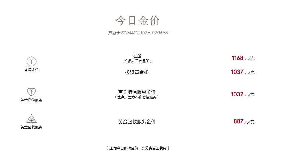 10月9日,周生生足金(饰品、工艺品类)克价冲上1170元,较国庆节前一天(9月30日)上涨45元;周福、六福足金克价均为1168元,较9月30日的1123元上涨45元;老庙黄金足金为1160元/克,较9月30日上涨34元/克;周六福、老凤祥(600612)、潮宏基(002345)等品牌足金价格上涨幅度均在30至40元/克之间。