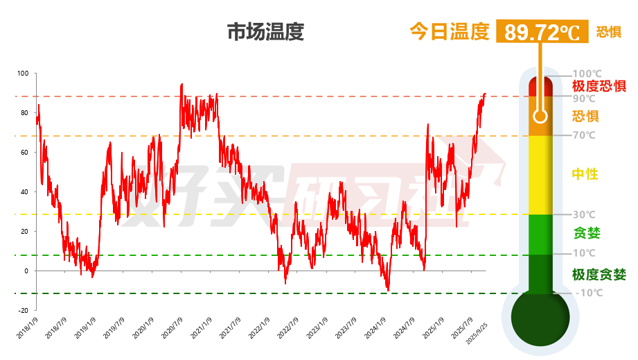 最近市场温度上升较快,今天(2025/10/9)市场温度为89.72℃,处于恐惧区间。仓位高的达到目标收益可部分止盈;仓位适中的守好仓位即可,谨慎追涨;仓位轻的保持耐心,等待回调机会。