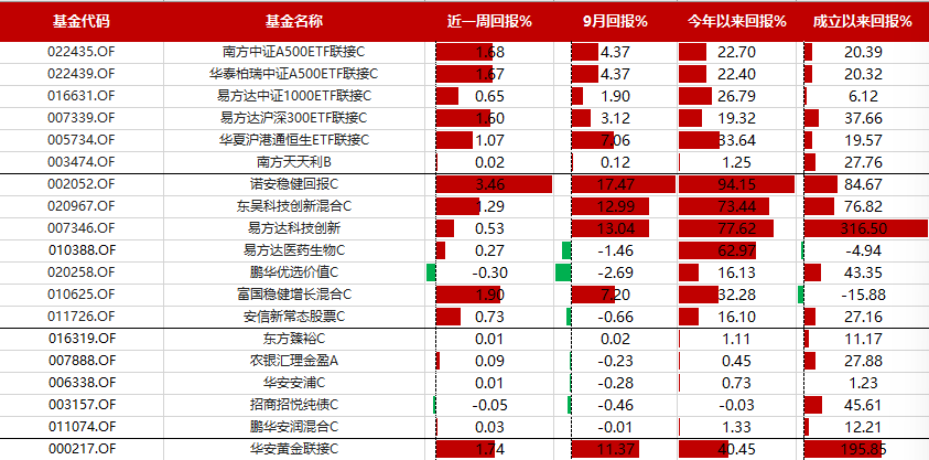 节前一周(9.25-9.30),A股继续向上冲击3900点,风格表现上成长好于价值,大盘好于小盘,宽基指数中大盘成长风格的中证A500表现最好。港股震荡上行,均线不断抬升。卫星仓三只科技基金中,依然是专注于AI赛道的诺安稳健回报涨幅最高,今年以来收益已经高达94%。创新药继续高位震荡,价值类基金表现较弱,均衡偏成长的富国稳健增长继续跑赢中证A500。债基9月集体“碎蛋”,但股市走到较高位置的当下,维持原本并不多(20%)的债基配置还是很有必要的。黄金继续高歌猛进。