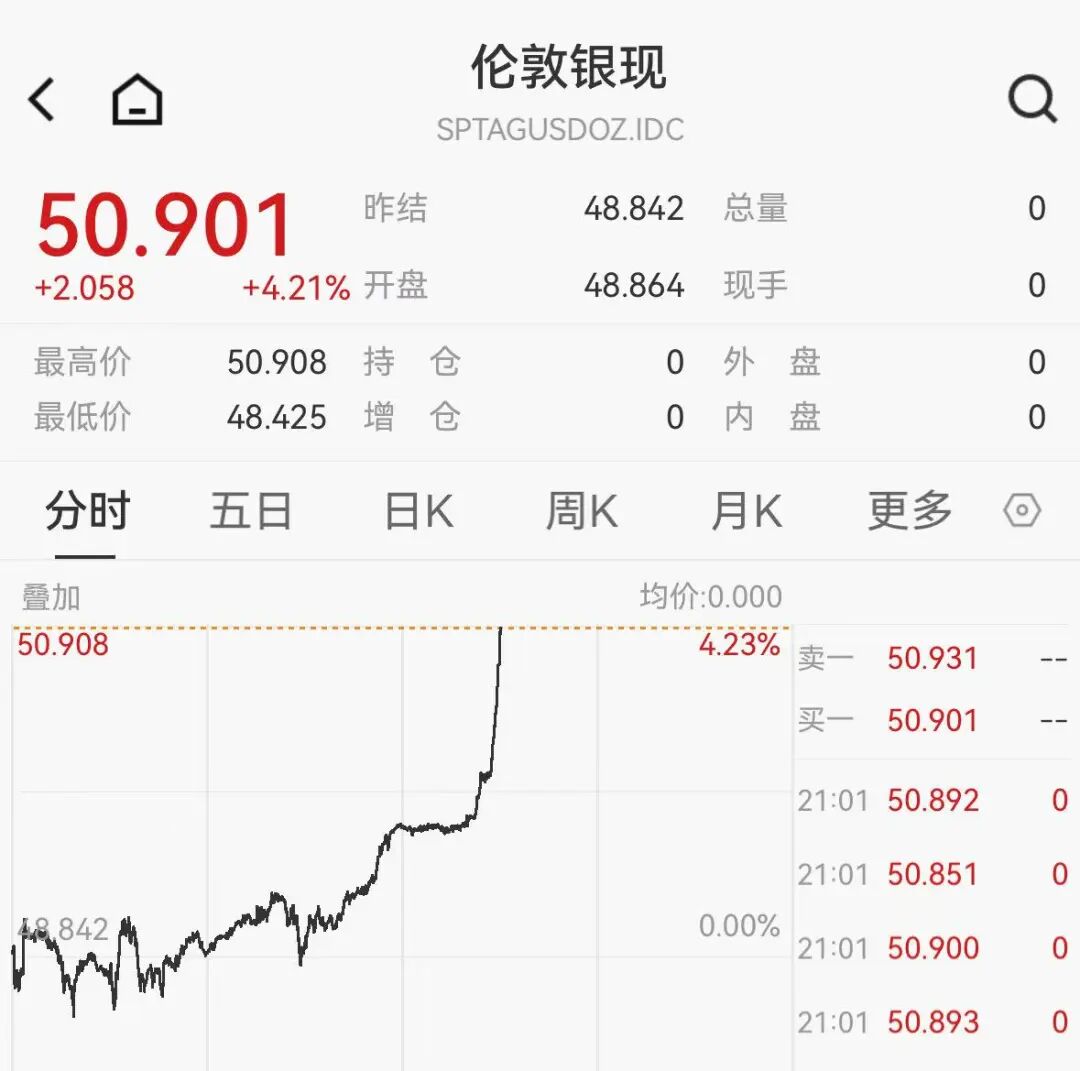 10月9日晚间,现货白银历史首次升至50美元/盎司关口上方,年内累计涨逾73%,表现优于黄金。
