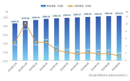 本报讯 记者王蓓报道 10月7日,中国人民银行公布数据显示,9月末黄金储备为7406万盎司(约2303.53吨),环比增加4万盎司(约1.24吨),8月末为7402万盎司(约2302.28吨)。央行连续第11个月增持黄金,共增持126万盎司(约39.19吨)。