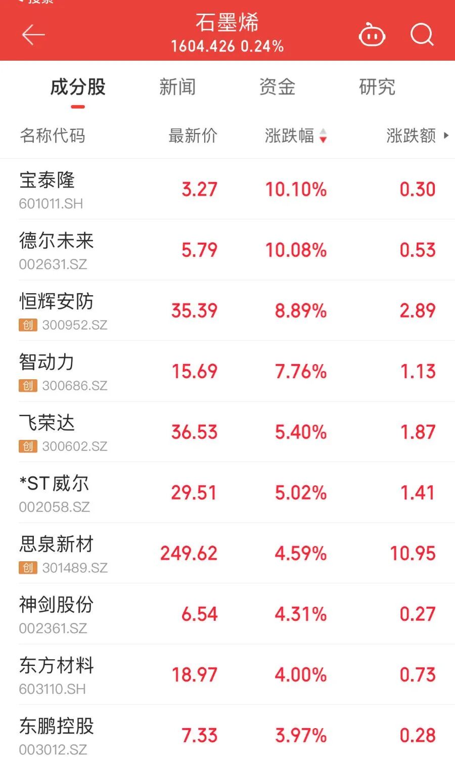 10月10日,石墨烯概念逆市活跃,宝泰隆(601011)、德尔未来(002631)涨停,恒辉安防(300952)、飞荣达(300602)、东方材料(603110)等跟涨。消息面上,商务部、海关总署发布公告,公布对锂电池和人造石墨负极材料相关物项实施出口管制的决定。