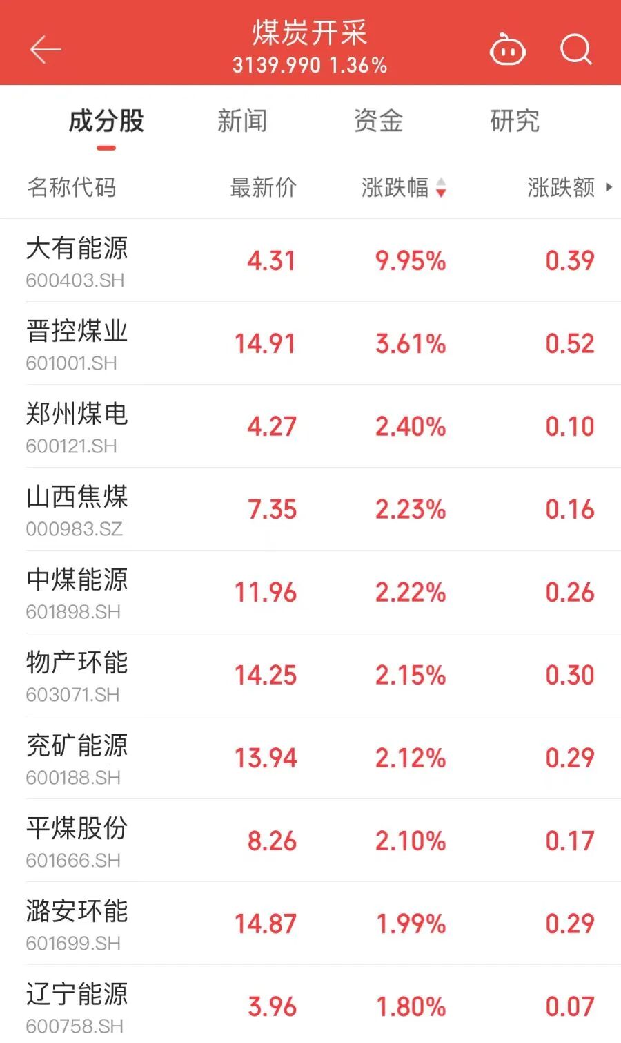 煤炭开采加工板块震荡上扬,大有能源(600403)涨停,晋控煤业(601001)、山西焦煤(000983)、郑州煤电(600121)、潞安环能(601699)跟涨。