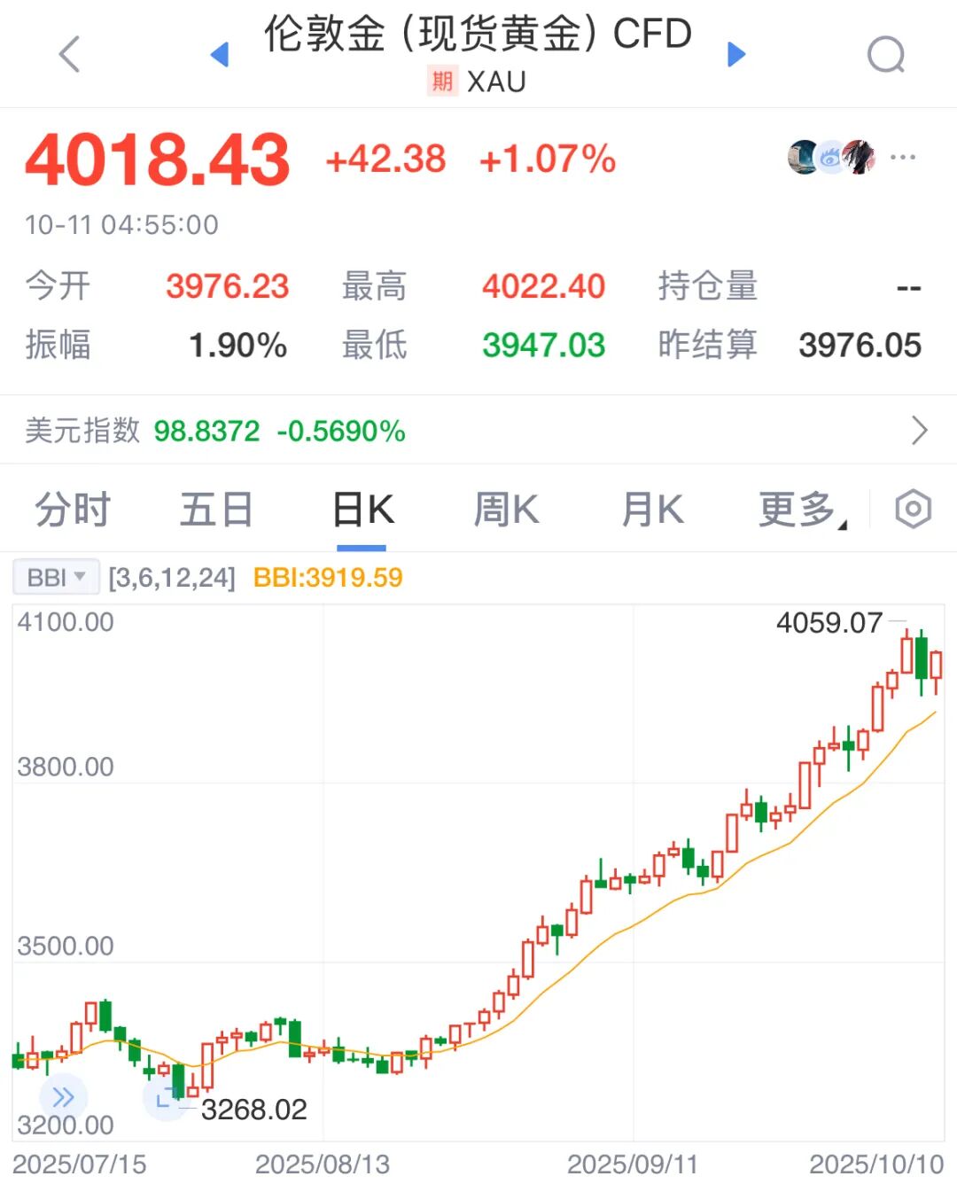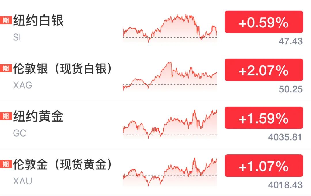 10月11日,现货黄金重新站上4020美元/盎司关口,截至发稿前涨逾1%,报4018.43美元/盎司。与此同时,现货白银也大涨。