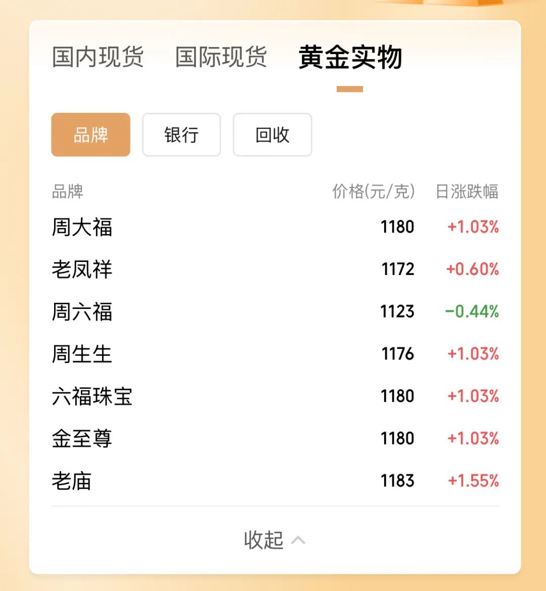 国际金价飙涨,带动国内品牌金饰价格同步走高。今日,老庙黄金足金饰品报1183元/克,较上一日大涨18元/克。周大福、六福珠宝足金饰品为1180元/克,周生生足金饰品为1176元/克,均有明显上涨。