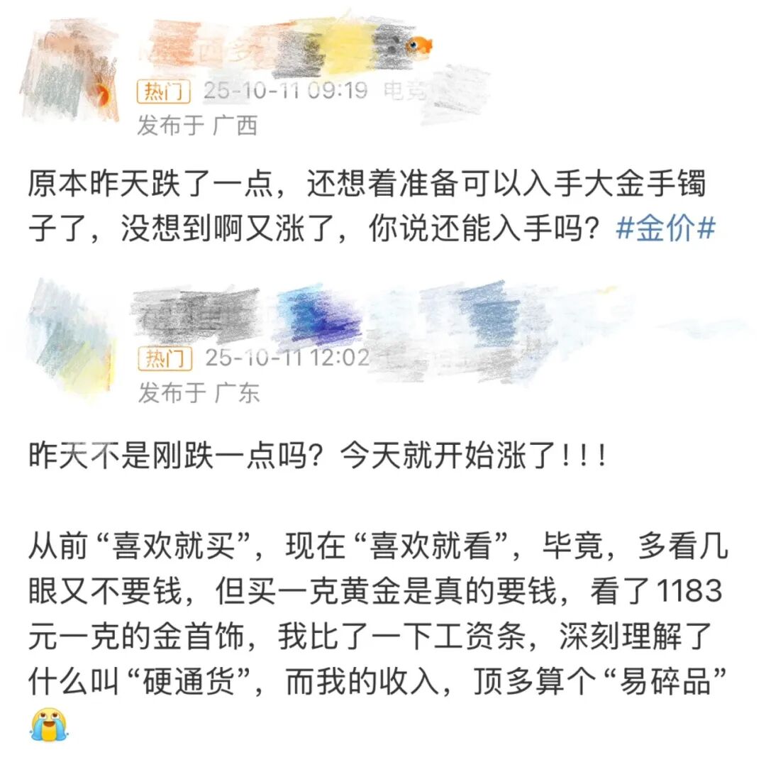 金价在短暂跳水之后,再次大涨。10月11日,“金价”相关话题在社交平台再次引发热议,登上热搜。网友纷纷表示,“真的老后悔了”“以前不知黄金好”“太贵了买不起”。