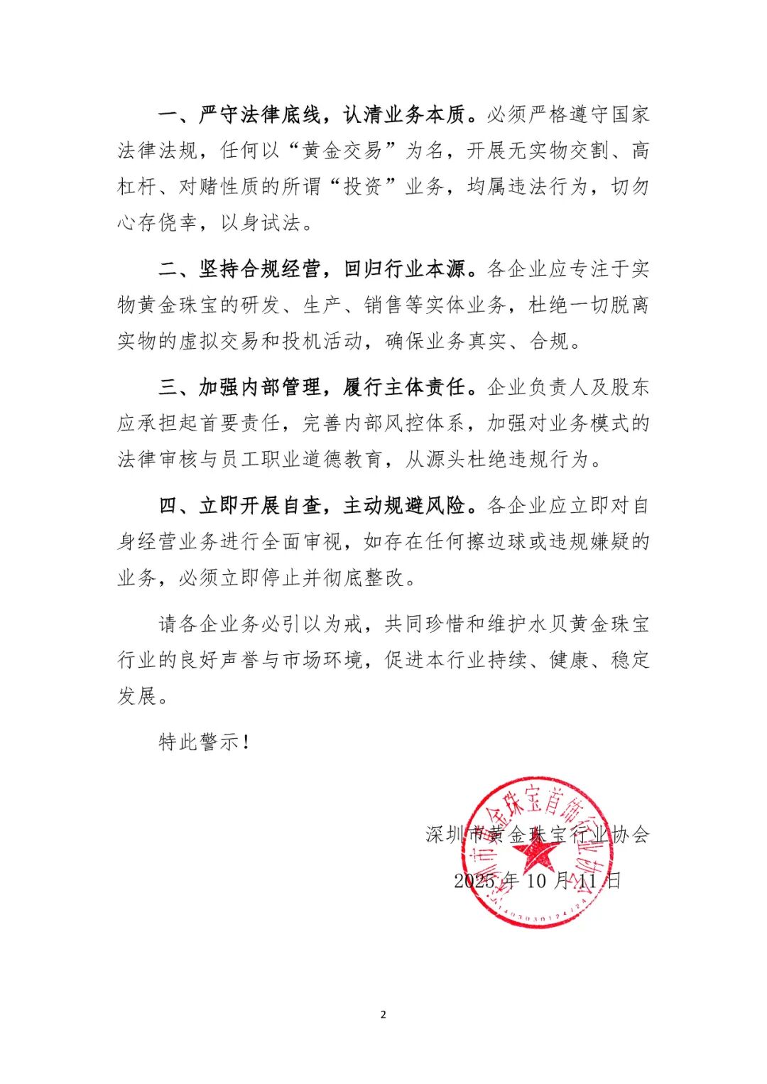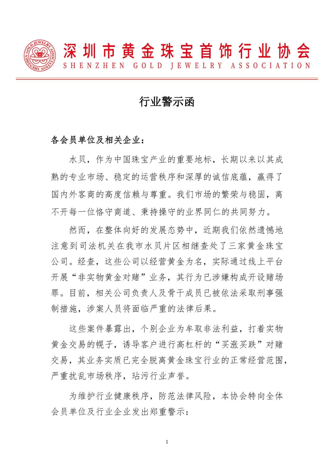 警示函称,“近期我们依然遗憾地注意到司法机关在深圳水贝片区相继查处了三家黄金珠宝公司。经查,这些公司以经营黄金为名,实际通过线上平台开展‘非实物黄金对赌’业务,其行为已涉嫌构成开设赌场罪。”