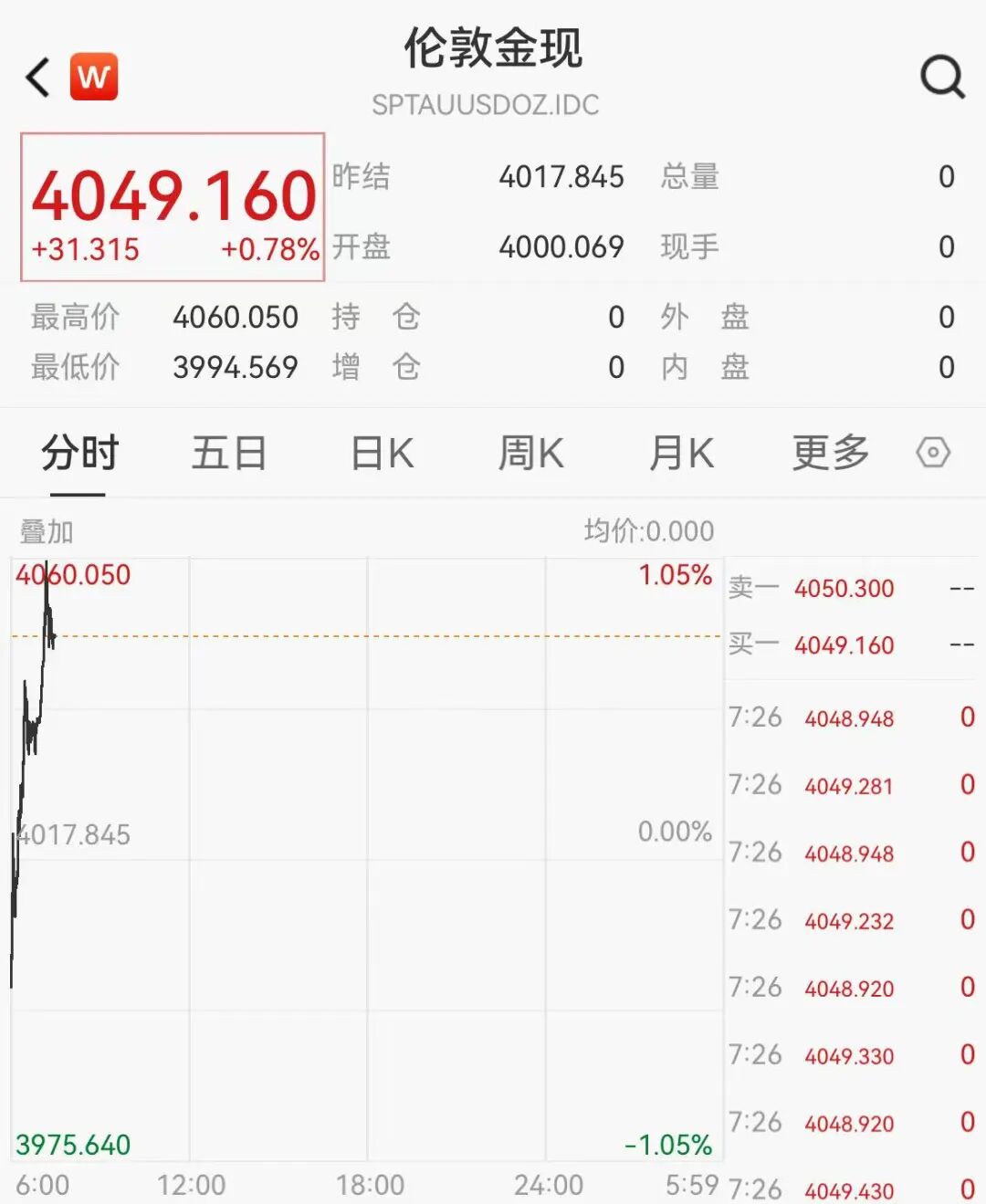 10月13日,现货黄金开盘快速拉升,一度涨破4060美元,刷历史新高。截至7时30分左右,涨幅略微收窄,最新报4049.16美元/盎司。