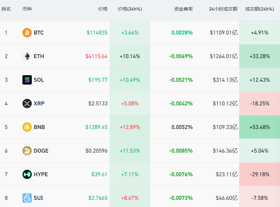 截至13日7时15分,加密货币集体上涨。此前一度从12.2万美元高位跌至10.15万美元的比特币,最新报114835美元/枚,以太坊、BNB、XRP、狗狗币等纷纷跟涨。